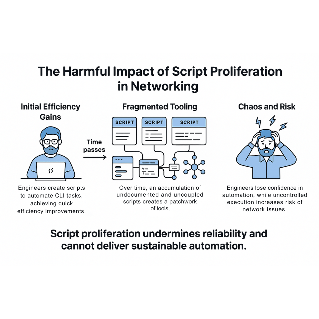 At first glance, scripting feels like progress. When a network engineer writes a Python or Bash script to automate a repetitive CLI task, it’s easy to celebrate the efficiency gain. That single script might save hours, avoiding tedious, error-prone manual steps.